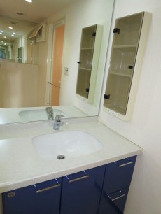 キッチンと同じブルーが使用された洗面化粧台。三面鏡ではなく一枚鏡が使用