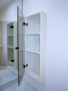 収納は洗面化粧台サイドに、小物がしまえるサイズのものがあるほか