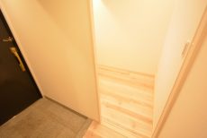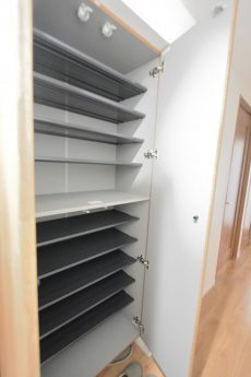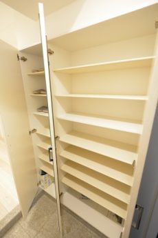 シューズボックスはトールタイプが二つ。収納力は抜群です。棚板の高さが変えられるので、ブーツなどでも収納可能ですよ。