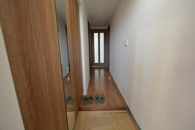 廊下の突き当りがリビングダイニング。壁面に、大きめのミラーが貼られています。