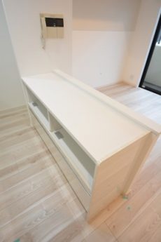 調理台の後ろには、収納兼家電スペースのカウンターが設置されています。作業スペースとして使ったり、忙しい朝食などはこちらで済ます事もありそうですね^^;)家電スペース奥にはコンセントも付いていますよ。