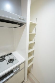 調理台横には収納棚、カウンター横には冷蔵庫スペースがありました。収納はタップリな印象…充実してます(^^)