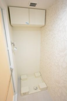 奥には洗濯機スぺ―スになっています。吊戸棚も付いているので、洗剤や柔軟剤など洗濯関係の物をまとめて置いておく事が出来ますよ。