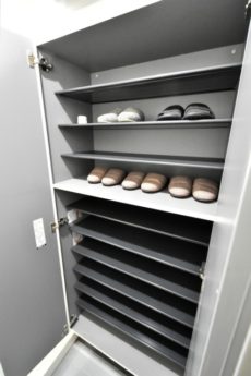 人感センサーが自動的にライトを点けてくれるので、荷物で両手がふさがっていても大丈夫!暗い中スイッチを探す必要もありません。いつでも明るい玄関が迎えてくれるのは嬉しいですよね♬ シューズボックスはトールタイプ。収納力抜群で30足以上入ります。可動式の棚を調節すればブーツなども収納可能ですよ。