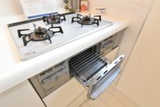 コンロ下にはグリルも付いています。魚だけでなくどんなお料理にも使えますので、どんどん使って下さいね。ただし、使用時には換気扇をお忘れなく!