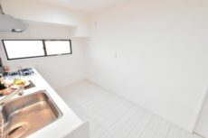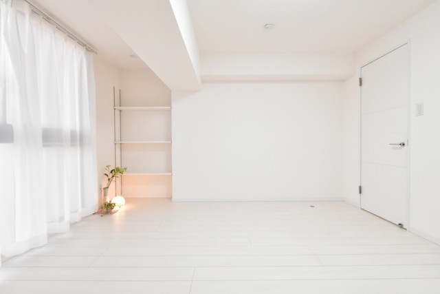 扉の奥は約14帖のLDK。クロス、フローリング、建具、キッチン全て白!パッと明るい空間です。家具もどんな色あいの物を置いても馴染むのではないでしょうか。