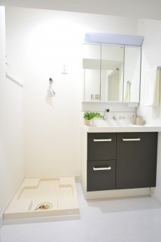 洗面化粧台は鏡の裏、引き出しと収納豊富。ゴチャゴチャ散らかりがちな洗面まわりもスッキリと片付いた状態をキープできるハズ。お隣は洗濯機置場になっています。