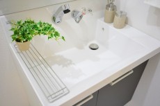 収納は洗面台下と三面鏡裏のキャビネット。細々した物が多くなりがちな洗面廻りには、豊富な収納は有り難いですね。様々なタイプがあって大きな物から細かい物までスッキリ収まりそうです。洗面ボウルに渡した水切りラックも意外に活躍してくれルんですよね(^^)