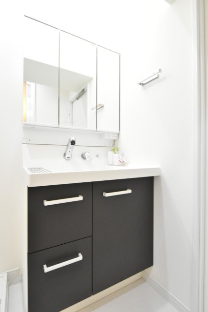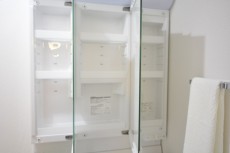 洗面台は360°チェック出来る三面鏡付き。上部に付いたの照明のおかげで鏡を見る時に影になることもありません。