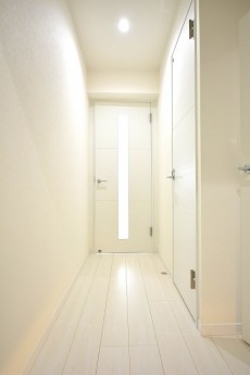 玄関からは白を基調とした廊下が伸びています。真っ白だとでちょっと不思議な感じがしますね。形は普通の廊下なのにB級映画に出てくる近未来のようです(笑)