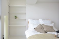クローゼットが2つ、反対壁面にオープンシェルフと収納スペースも豊富につくられています。広い洋室をより広々使えるのがうれしいですね。