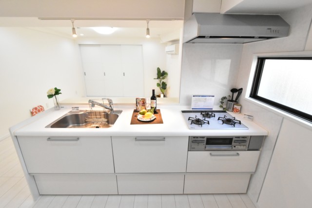 浄水機能付き水栓、3口コンロ、キッチンカウンターとスペックも◎!