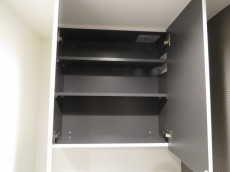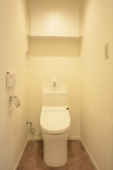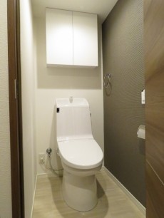 トイレはウォシュレット付き。ペーパーのストックや掃除道具の保管に便利な吊戸棚が設置されています。