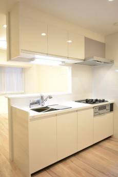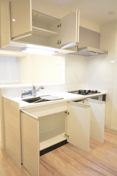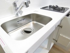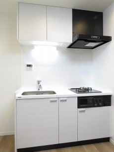 キッチンはモノトーン調。コンロは2口ガスコンロ、水栓は浄水機能がついています。一人暮らし分のキッチングッズなら上下の収納スペースに収まりそうです。