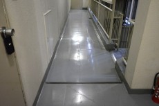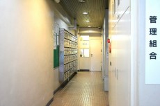 1階の共用部。細長い通路になっており、正面に管理人室があります。