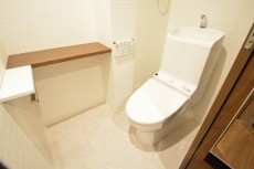 トイレはウォシュレット付き。吊棚も設置されていますので、トイレットペーパーのストックはこちらへ収納できます。横のカウンターには芳香剤や本なんかも置いておけます。