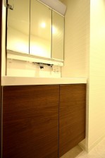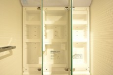 洗面化台は三面鏡の裏に収納トレイが取り付けてあります。ハブラシなどのゴチャゴチャ散らかりがちなアイテムもスッキリお仕舞いただけます。
