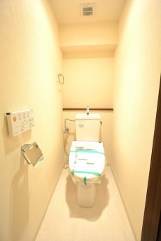 上部には扉付きの吊戸棚がありますので、ちょっとしたトイレ用品を仕舞っておくことができます。トイレに設置された様々な機能は壁付けのパネルで操作します。