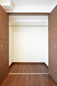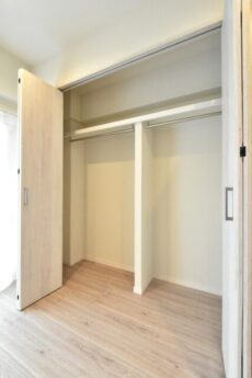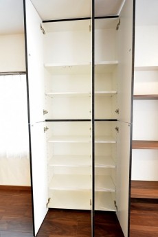 動きが滑らかでスムーズに開く扉なので、開け閉めが楽です。こういったちょっとした所でストレスを感じなくて済むのは助かります。バー付きのクローゼットと可動棚タイプのクローゼットになっています。