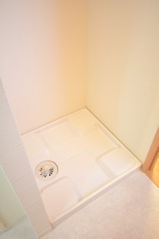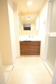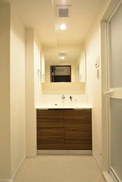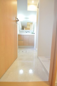 入って左側にランドリースペース、正面に洗面台があり右側にバスルームの配置です。