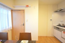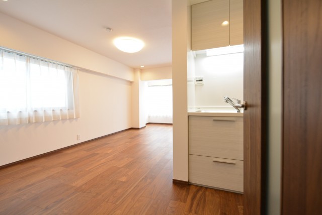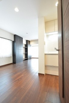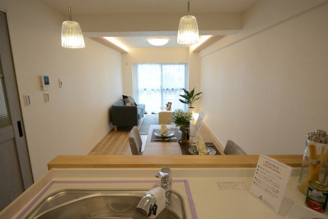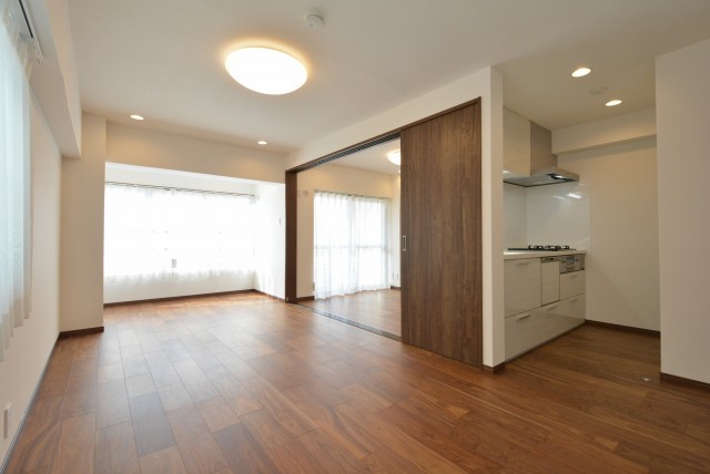キッチンが手前の壁付けになっているので、お部屋が広々としています。洋室を区切っているスライドドアのレールが床に無いので、フラットな広いスペースに感じさせます。