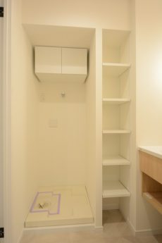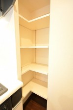 キッチン横にはL字の高さ調節可能な可動棚があり背の高い物も収納できます。
