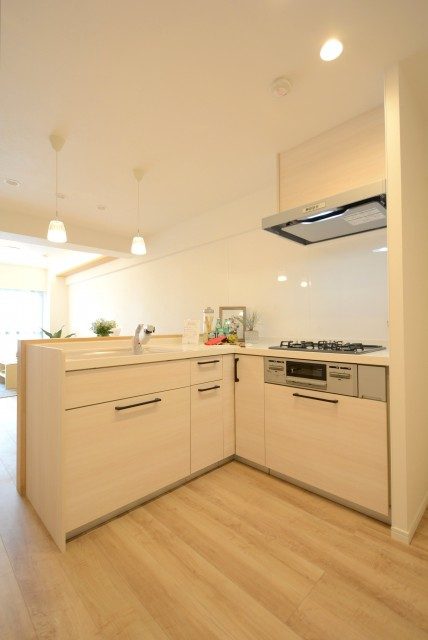 リノベーションマンションの定番!システムキッチンです。薄茶色のパネルがお部屋に違和感なく馴染んでいます。