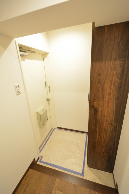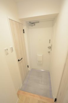 1DKのお部屋の広さから考えると、広めの玄関です。ゴルフバッグなどが置けるスペースもあります。シューズボックスの扉の1枚は鏡になっていますよ!