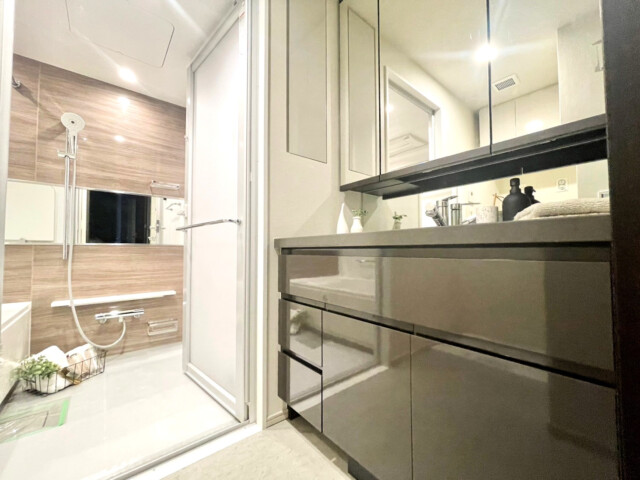 洗面化粧台は身だしなみを整えるのに便利な三面鏡付き。縁が木目なのがちょっとホッとしますね。三面鏡裏のミラーキャビネットや洗面台下のスライドキャビネットなど収納も充実。大きなものから細かいものまでバランスよく収納可能です。