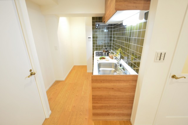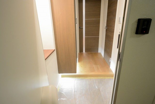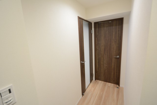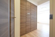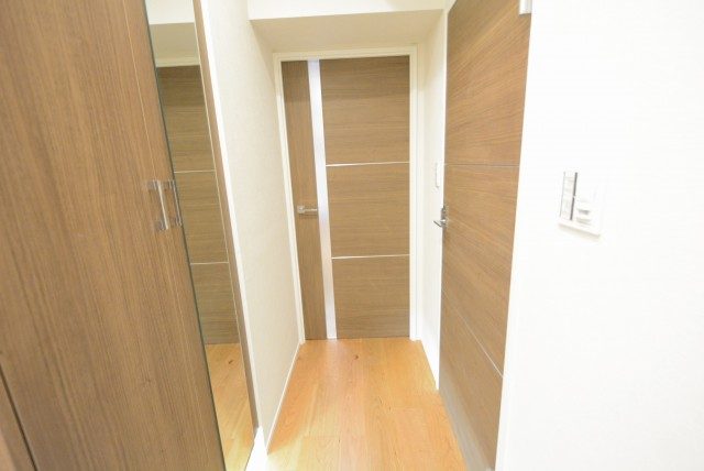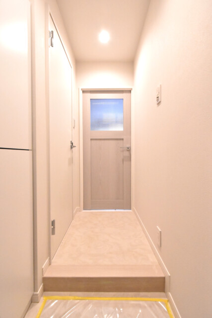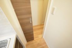 玄関をあがると廊下がまっすぐのびており、左側に収納、正面にダイニングキッチンの扉がついています。宅急便など玄関先での来訪があってもこれなら居住スペースが見える心配はありません。