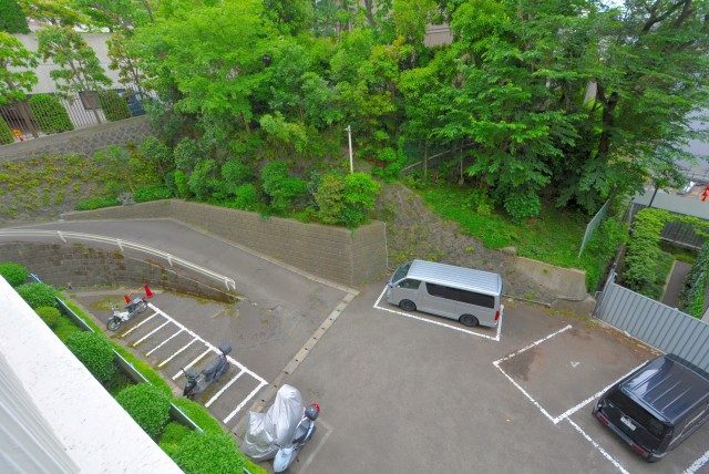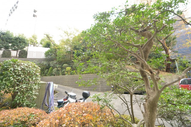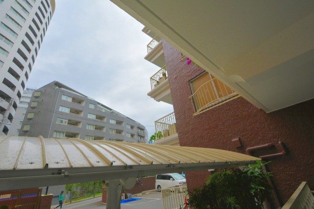前の建物とは距離があり解放感のある眺めが広がっています。間のスペースには綺麗に整えられた緑が植えられていて目にも優しいですね。