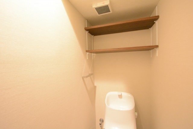 トイレはウォシュレット付き。ペーパーのストックや掃除用具は上の棚へどうぞ。