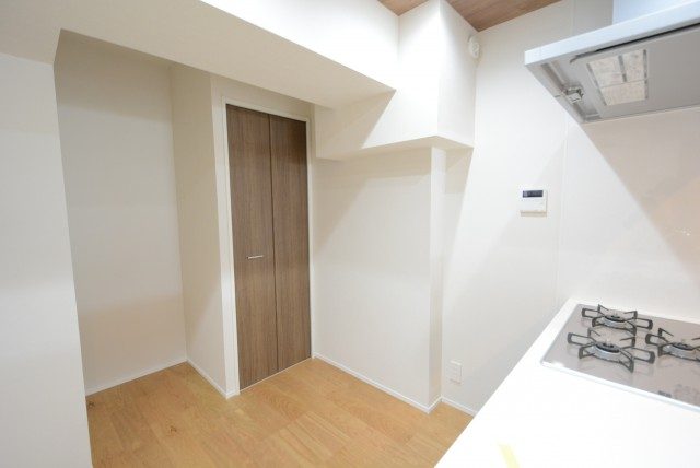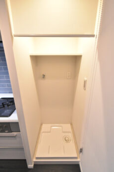 キッチンの奥には洗濯機スペース!!洗面室にあるイメージが強いですが、最近では廊下やキッチンにあるのをよく見かけるようになりました。ロールカーテンが付けられているので使わない時は隠しておくことが出来ますよ。
