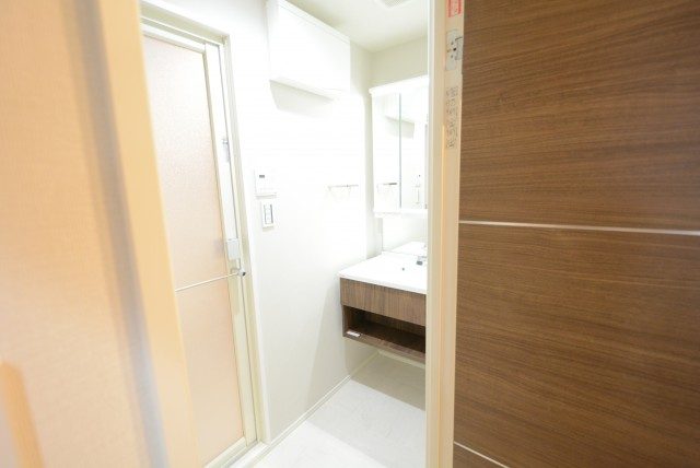 洗面室。洗濯機置場、先見化粧台、バスルーム、トイレと水廻りの設備が1か所にまとまっています。