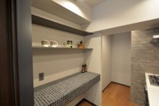 ダイニングキッチンの壁面には調湿・消臭効果のあるエコカラットがついており、ダウンライトで照らされています。ダイニングキッチン内には窓がないのですが、空気も快適に保てそうです。