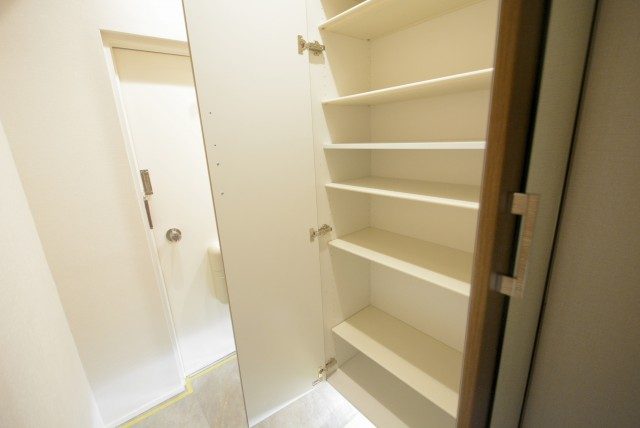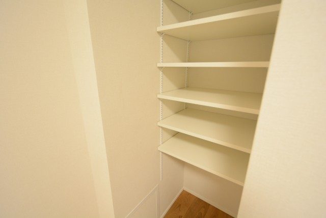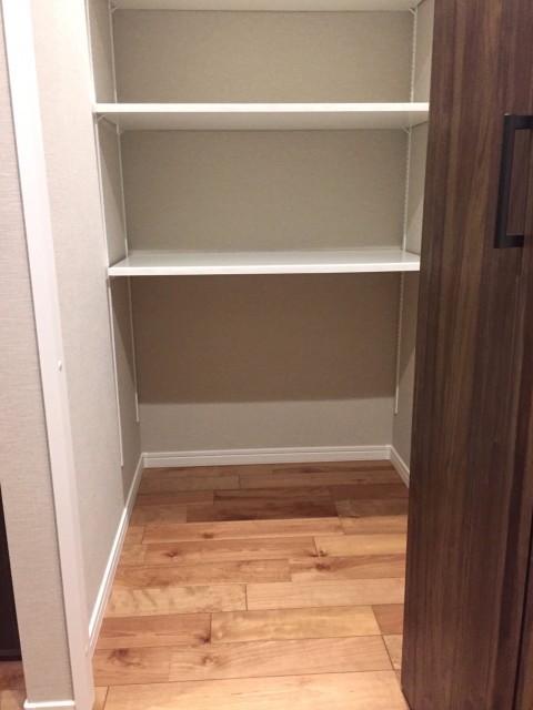 廊下収納は高さが調節できる棚付き。日用品のストックなどはこの中でまとめて管理できそうです。