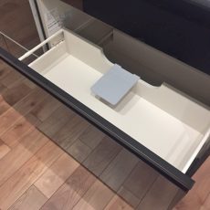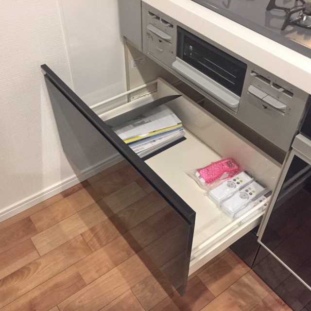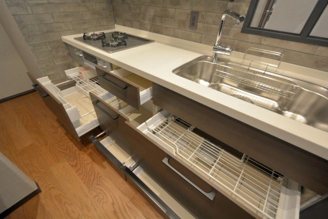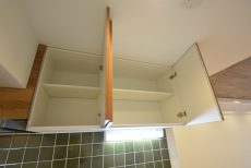 収納は調理台下のスライドキャビネットと吊戸棚。スライドキャビネットは出し入れがしやすく奥の方に入れるのも簡単です。ぎっしり詰めても中身が確認しやすいのもいいですね。