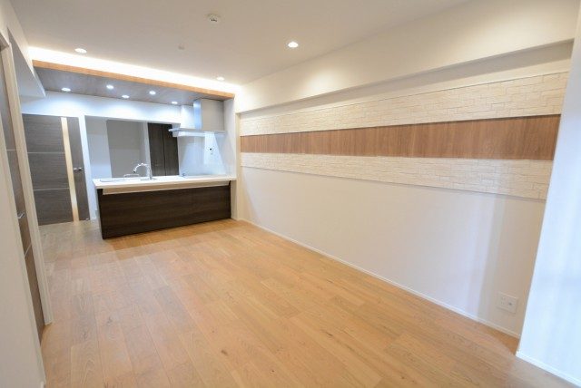 NK五反田コータース エコカラットダイニングキッチンの壁面には調湿・消臭効果のあるエコカラットがついており、ダウンライトで照らされています。ダイニングキッチン内には窓がないのですが、空気も快適に保てそうです。