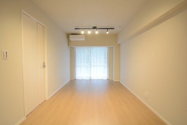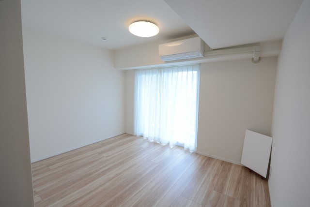 ダイニングテーブルとソファを置いても広々としていますね!エアコンも新規で1台設置されています。