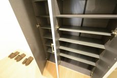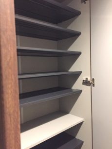 シューズボックスはトールタイプ。薄型なのでブーツなどの背の高い靴は入りませんが、陳列棚のように中が見やすいのは靴を選ぶ際に便利ですよ。