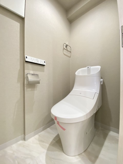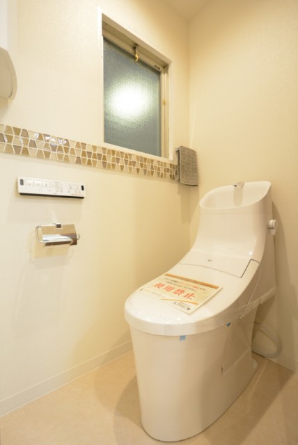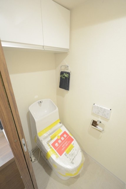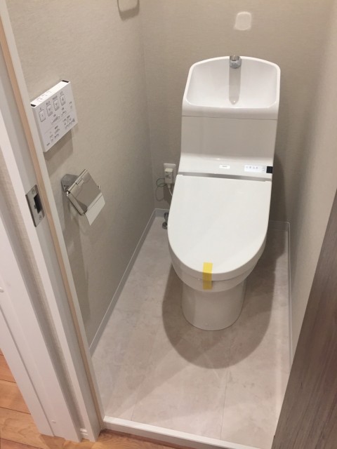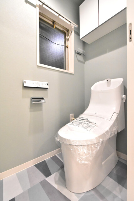 個性的な床ですね!!!トイレはLIXIL製の洗浄機能一体型。トイレットペーパーや掃除道具を入れるのに便利な吊戸棚も付いています。窓も付いていますが外は内廊下なので開けておくのはお勧めしません(^-^;