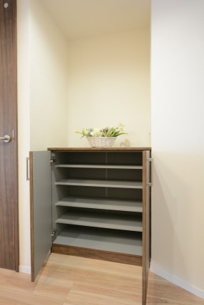 玄関横に設置されたシューズBOXはたっぷり収納できるトールサイズ。表扉の半分には縦長の鏡がついており、お出かけ前の身だしなみチェックもサッとおこなえて便利です。