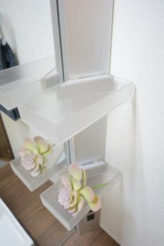 鏡の裏はキャビネットになっているので、洗面周りに溢れる細々としたものをスッキリ収納しておくことが出来ますよ。洗面ボウルは遠目に見た時は木製?と思ったのですがもちろん違います(笑)アクリル系人工大理石という素材で出来ているそうです。小物置きのプレートは置いてあるだけなので移動や撤去も自由。使いやすいように使っていただけます。