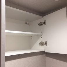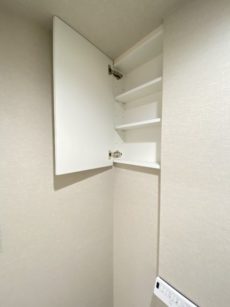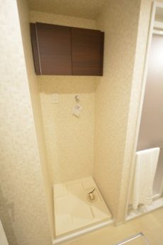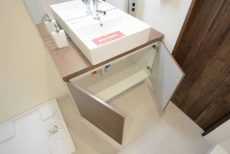 洗面化粧台の横には小物の収納に便利なキャビネットが設置されています。すぐ隣が洗濯機置場なので洗面ボウル下のスペースに洗剤を入れておくと使い勝手がよさそうです。