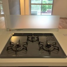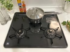 コンロは二口、グリル付き。最近は電子レンジやトースターを併用するレシピもたくさんあり、コンロは二つあれば十分じゃないかな~とか思っています。ただし、コンロにかけていた鍋などを置いておくところが欲しいので、鍋敷きなどを用意しておくとよさそうです。