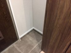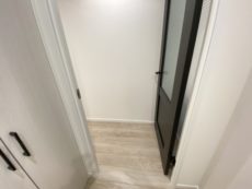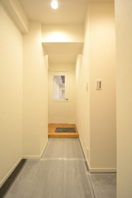玄関から廊下にかけては明るい色合いでまとめられています。正面の扉は照明のせいでベージュのように見えますが実際は明るいグレーなんですよね。写真難しいです(^-^;