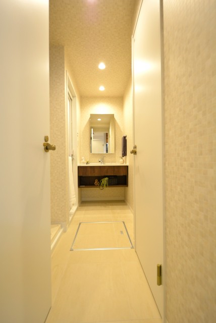 NK五反田コータース 洗面室扉洗面室の扉はキッチンのすぐ近くにあります。お料理に洗濯、お風呂掃除と家事もまとめてこなしやしそうです。