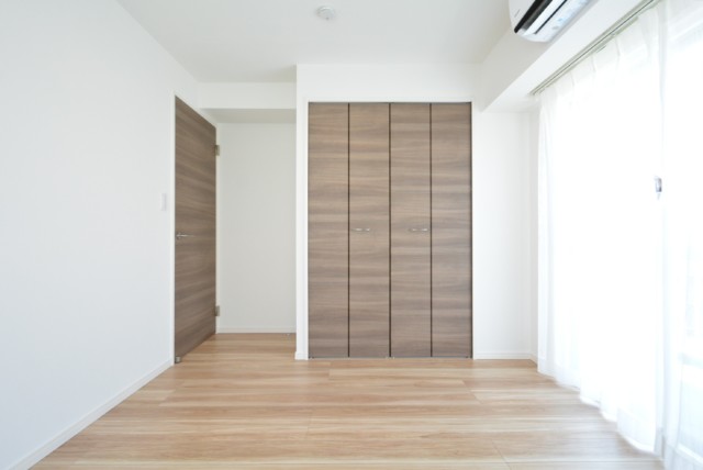 こちらのお部屋も陽射しが入り、明るいですね!収納も見た目はさきほどご紹介したクローゼットと同じサイズに見えますが、間口が狭いだけで、右側にもっとスペースがあります。
