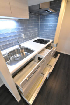 システムキッチンの右側が仕切り壁のような小さなカウンターになっているのでリビングから作業スペースはあまり見えません。水栓はノズルが伸びるのでお掃除も楽ですね!スポットライトで手元を明るく照らせばお料理もしやすいでしょう。収納は残念ながらキッチン下にしかありません。それでも十分大きい収納です。