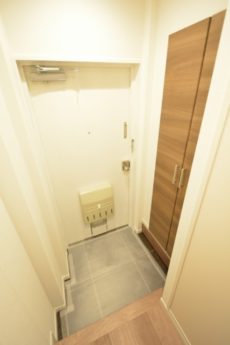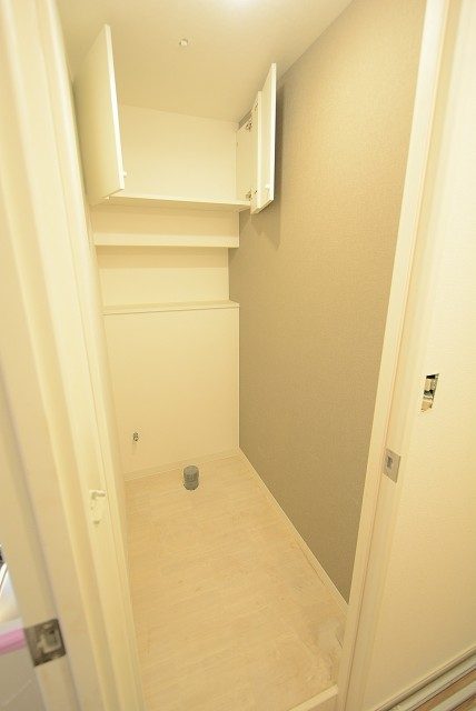 ホールには扉付きの洗濯機スペースもありました。中の棚には洗剤や洗濯ネットなどの洗濯物グッズも収納可能。